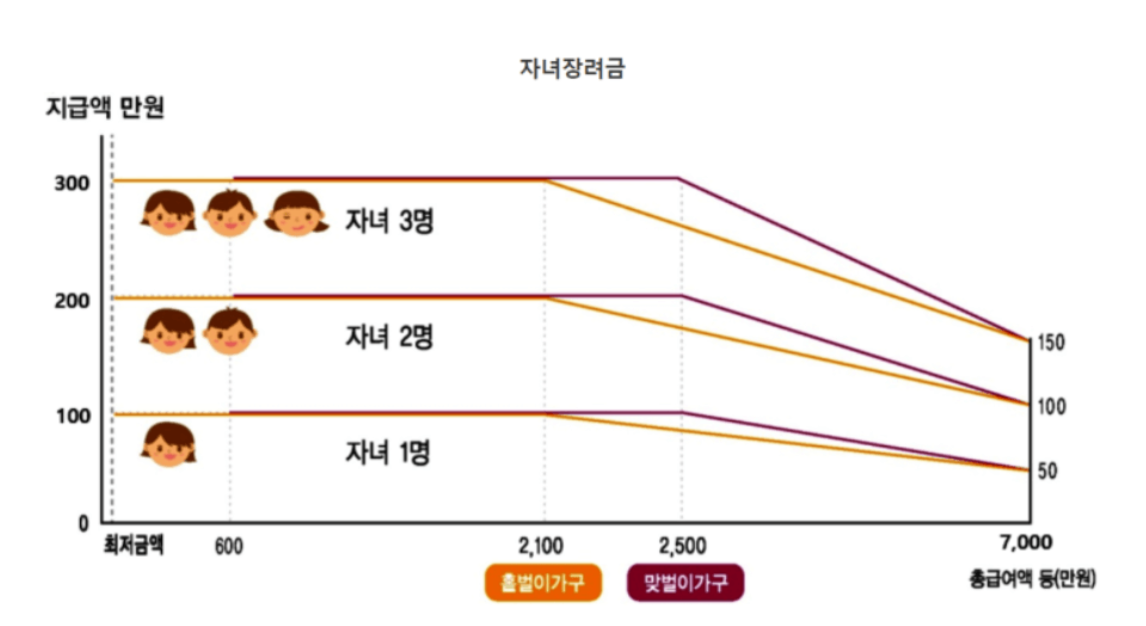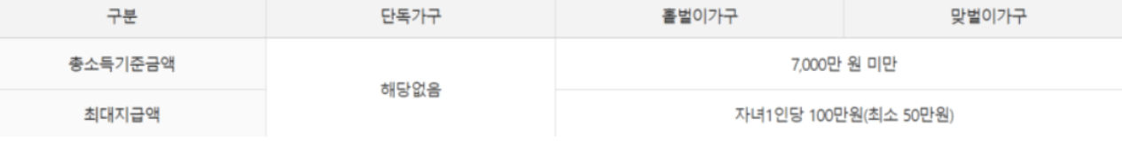 | 맞벌이 | 신청인과 배우자 각각 총급여액 등이 3백만원 이상인 가구 | 600 ~ 7000만원 | 50 ~ 100만원 (자녀 1인당) |